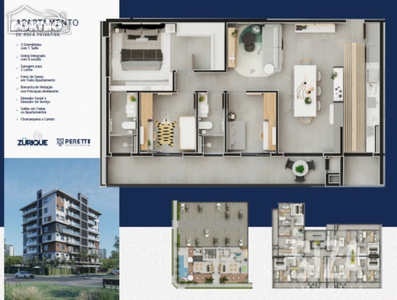 Todos apartamentos possuem 1 suíte e 2 vagas de garagem.