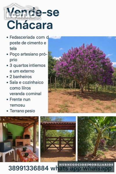 Chácara plana, toda cercada com postes de cimento e tela, localizada no asfalto, com fácil acesso e vizinhança tranquila (médicos e dentistas).